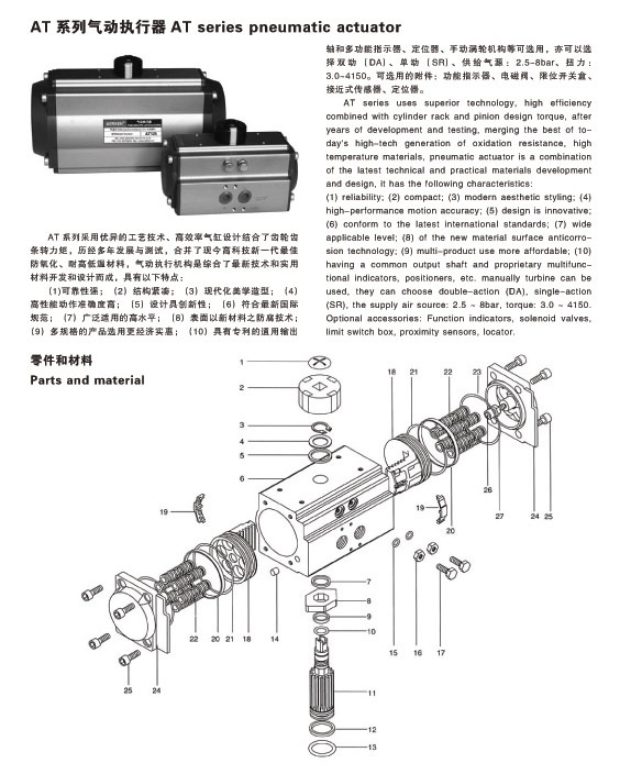 (10)具有专利的通用输出轴和多功能指示器、定位器、手动涡轮机构等可选用,亦可以选择双动(DA)、单动(SR)、供给气源:2.5~8 bar、扭力:3.0~4150。